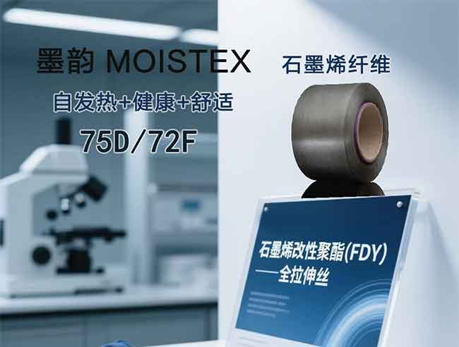 常见做法:以石墨烯改性涤纶或尼龙长丝(DTY/FDY)与常规涤纶长丝交织或混纺,用于摇粒绒的面纱/地纱或作为功能嵌条;市售规格常见有70D/48F、75D/72F、150D/144F等,颜色多为灰/黑。